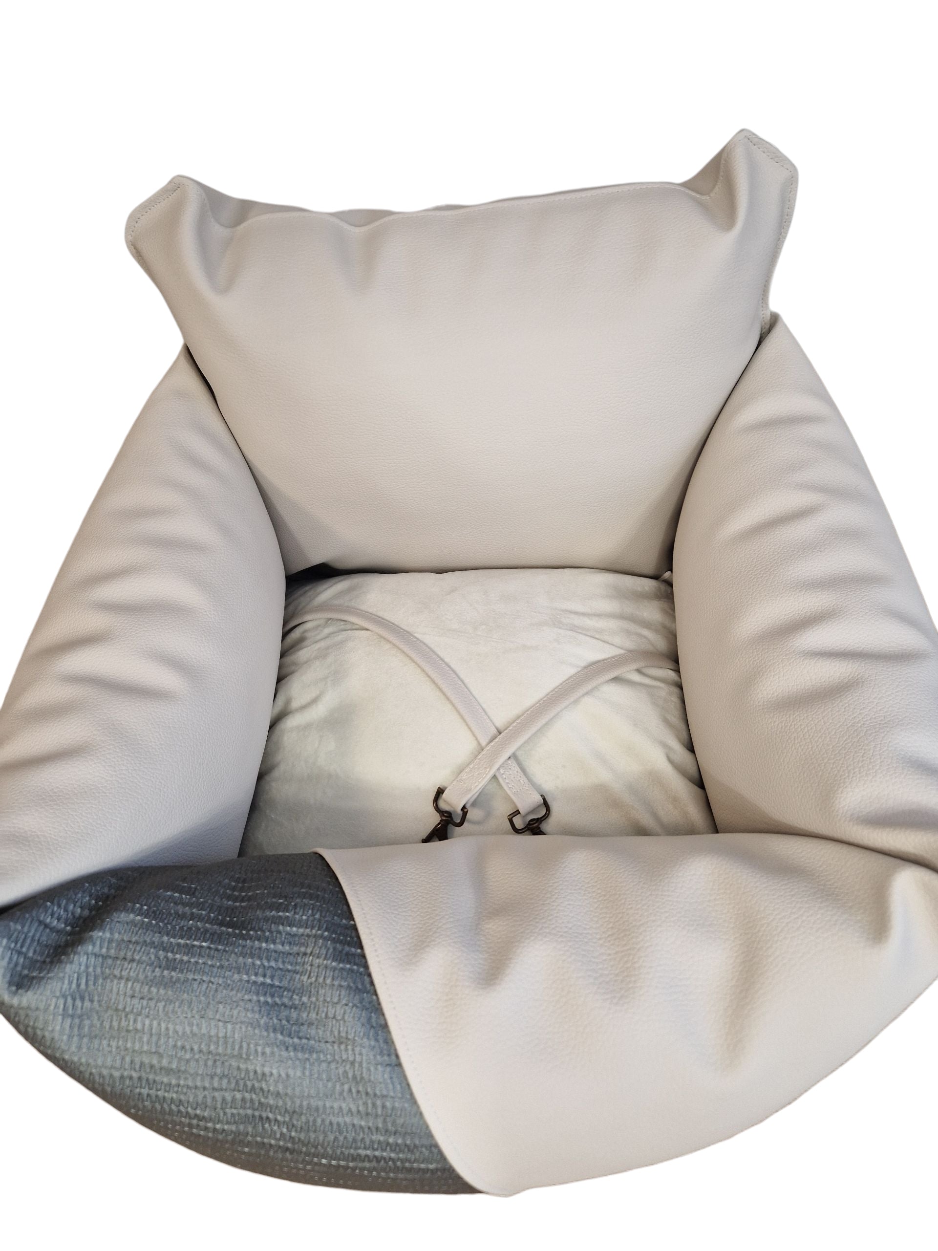 Izdelan je iz kakovostnega, mehkega umetnega usnja, ki daje razkošen videz in omogoča izjemno enostavno čiščenje. Blazina, na kateri sedi kuža, je obojestranska, mehka in v celoti pralna na 30 °C v pralnem stroju, prav tako tudi sam sedež – ker čist sedež pomeni tudi srečnega kužka (in lastnika).